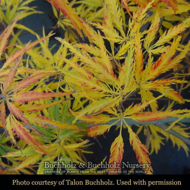 A weeping lace-leaf Japanese Maple. This unique variety get its name because the leaves curl down, giving the appearance of an eagle claw. Spring leaves are bright green fading to medium green with rose highlights if planted in the sun. The fall color is bright orange-yellow. Very durable and easy to grow.