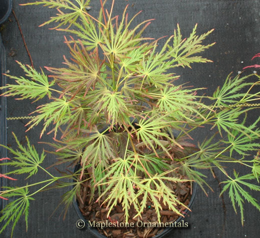 A weeping lace-leaf Japanese Maple. The spring leaves are green with a subtle rose blush. The summer color is green before turning vibrant yellow for fall. 'Green River' will emerge from dormancy later than other varieties, which protects it from late spring frosts. Introduced by Talon Buchholz.