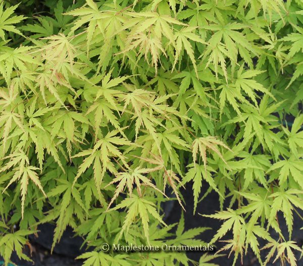 A dwarf, weeping Japanese Maple. This variety is one-of-kind. The growth habit is dense and weeping. The leaves are small and serrated. A mature specimen will be much wider than tall as it creeps along the ground, though it can be staked for more height. The spring and summer color is green changing to orange in the fall.