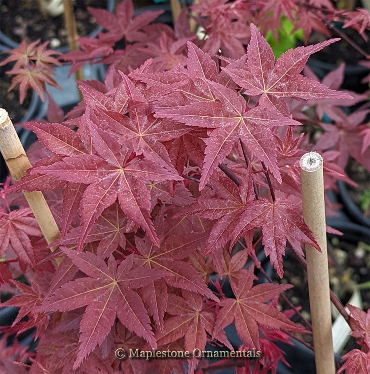 An upright-growing Japanese Maple. This variety is similar to 'Corallinum' but it shows more variegated flecking in the leaf. It is also more vigorous. The spring leaves are coral-pink. The summer color is green with a subtle red blush. The fall color is bright red.