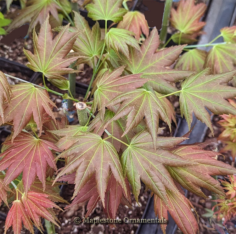 This dwarf Full Moon type Japanese maple is unique and beautiful. The leaf lobes curl downward. The spring color is brown-red with light green veins. The summer color is green with a subtle rose blush. The fall color is orange-red. Discovered by Talon Buchholz.