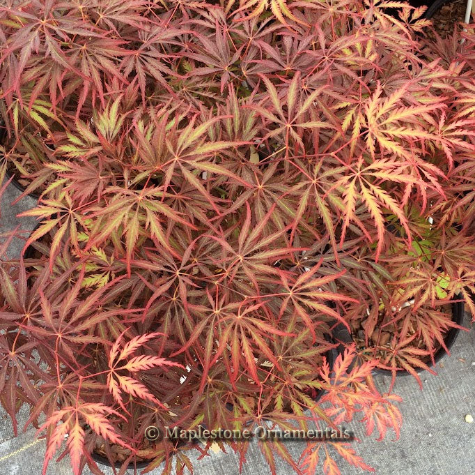 A weeping lace-leaf Japanese Maple. The spring color is very bright red which changes to bronze-red for summer. This variety was named because of it fall color, which is a stunningly bright red. Introduced by Elliot Groves of New Zealand.