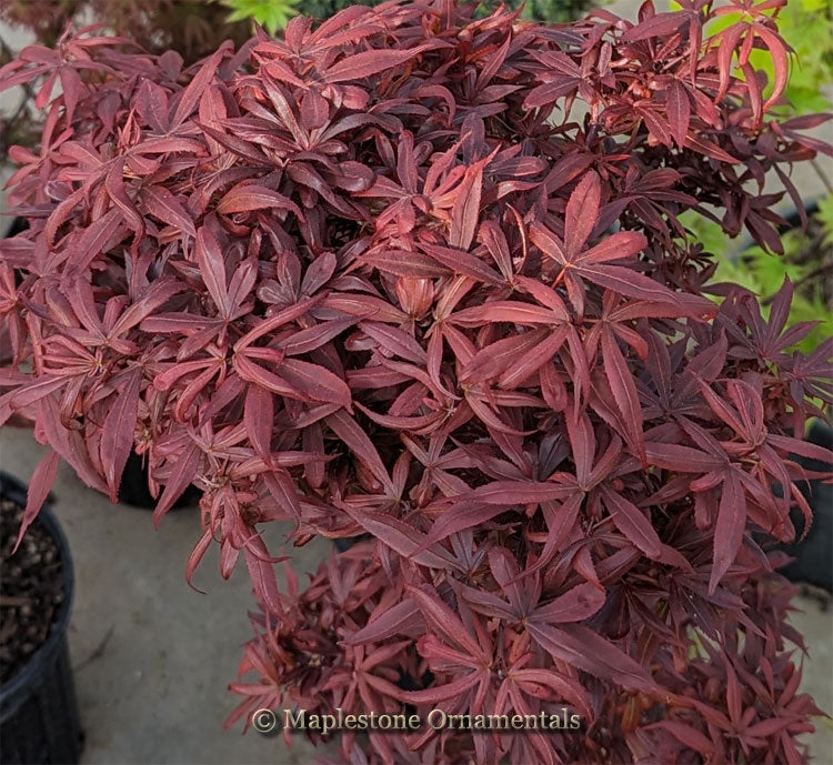 A dwarf Japanese Maple with a compact habit and medium to small leaves. The spring color is ruby red turning to darker maroon-red for summer. The fall color is bright red. 'Hime shojo' will hold its red color very well even in shady conditions. Its small size makes it a nice choice for a small spot in the garden or containers.