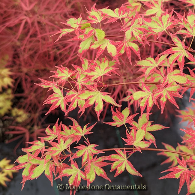 An upright-growing, variegated Japanese Maple. The spring leaves are green with a soft red margin. As the season progresses, the color on the margin intensifies to dark cherry red over a lighter green leaf. The leaves are small and deeply divided but the tree itself is fast growing and vase-shaped. To ensure optimal variegation, provide your 'Itami nibluki' with a balance of part sun and part shade. The fall color is bright red-orange.