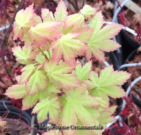 An upright Japanese Maple. The leaves of 'Koyamdani nishiki' have rounded lobes, giving a very unique appearance. The spring color is a soft yellow-green with rose highlights around the leaf margin. The summer color fades to green before changing to orange-yellow for fall. This variety was discovered growing wild in Japan.