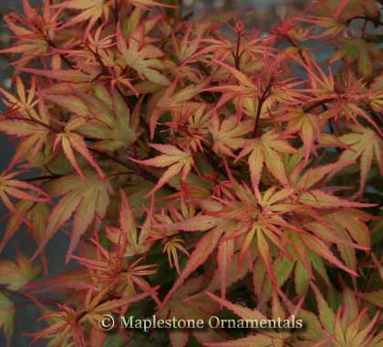 A dwarf, upright Japanese Maple with outstanding features. This is one of the best dwarf maples! The spring color is dark orange-red. As the season progresses, the leaf color becomes bronze green with rose or ruby-red margins, giving a striking two-toned appearance. The fall color is bright red. In the landscape, 'Kuro hime' becomes a very attractive dense tree that grows to around 5 ft tall. This variety is also very popular for bonsai work and container gardening. Fun to grow and durable in any climate.