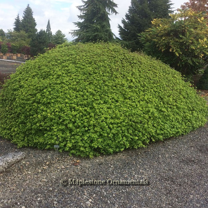 A dwarf Vine Maple with a compact habit. 'Little Gem' originated as a witches broom mutation on a vine maple. Also know by the name 'Alleyene Cook'. The spring and summer color is green turning to bright yellow in the fall. There will normally be swelling at the graft union, which is normal for this variety as well as most other grafted circinatum varieties.