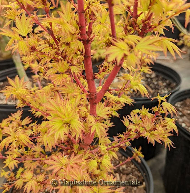 A dwarf Japanese Maple with a vigorous habit and brightly colored bark. Always very popular! 'Little Sango' is perhaps the most dwarf of all the coral bark types. The spring leaf color is soft orange with a red blush quickly changing to green with red edging and then to solid green for summer. The fall color is vibrant yellow-orange. During the dormant months, the bark color intensifies, making it glow in the winter landscape. Great for bonsai work or a small space in the garden. Discovered by Talon Buchholz.