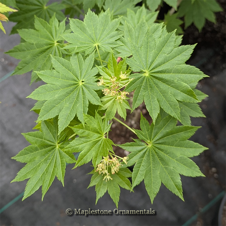 A rare variety of Full Moon maple with small circular leaves. The leaf lobes cup slightly upward. The spring color is light green turning to medium green for summer. The fall color is bright yellow infused with orange.