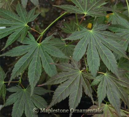 An upright growing Full Moon type Japanese Maple. 'Mirte' is a wonderful variety that is still hard to find in the trade. The spring leaves are a unique rose-red with light green veining. In summer, the color changes to bronze with red then medium green for late summer. The fall color is a vibrant combination of orange and yellow. A stately specimen tree for a focal point in the landscape.