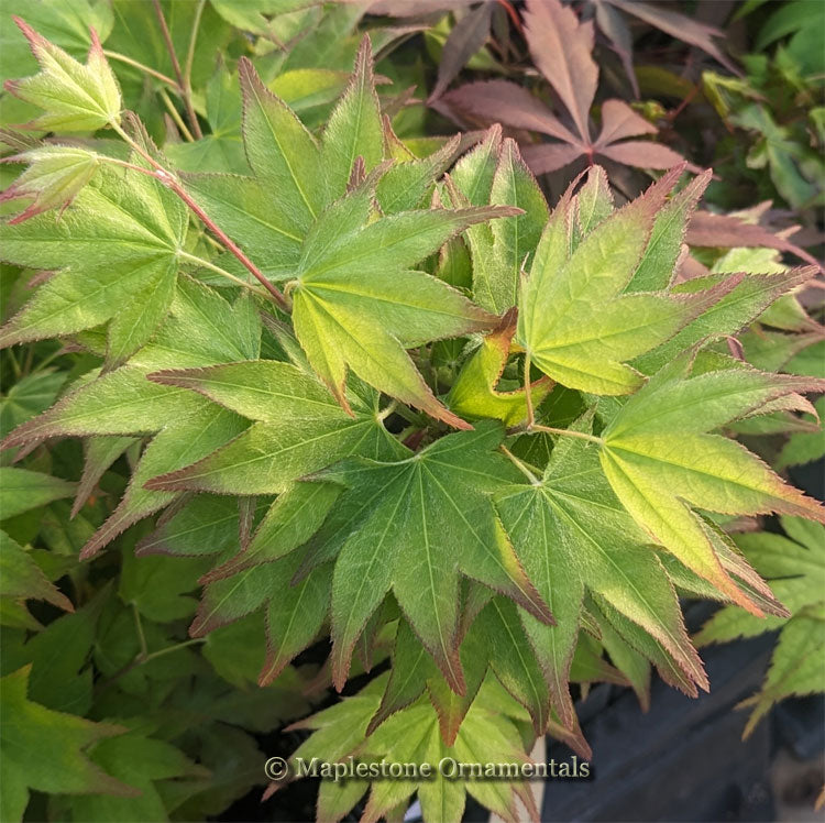 An upright-growing Japanese Maple. The spring leaves are bright yellow-green with soft red margins. In spring, the leaves have a beautiful "glow" that must be seen to be appreciated. The leaves change to green for summer. The fall color is brilliant shades of bright orange and red.
