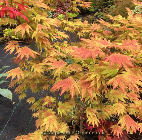 An upright growing, Full Moon type Japanese Maple with breathtaking colors. 'Moonrise' is one of the most popular varieties in the trade. The spring colors are bright orange-yellow with rose overtones. In summer the color changes to bright yellow-green with rose-colored new growth. The fall color is bright red-orange. One of the best features of 'Moonrise' is its ability to withstand full sun even in hot climates. Discovered and introduced by Carl Munn of Munn's Nursery in Oregon.