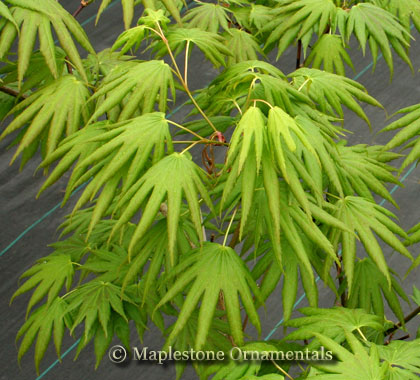 An upright growing Full Moon type Japanese Maple. The leaves are sharply pointed, resembling a child's drawing of the sun. The spring and summer leaves are green turning to orange-red in the fall. Discovered by Talon Buchholz.