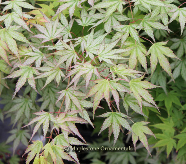 An upright Japanese Maple with dramatic spring color. This variety is very special. The spring color is nearly white with soft pink overtones. The display is further accented by the green veining on the leaf. The color display of 'Peve Multicolor' is affected by the environment. In hot southern climates, the spring variegation will be hit-and-miss. I have observed the best color when the tree emerges from dormancy with colder temperatures and partial shade. The summer color is green with a subtle white dusting on the leaf. The fall color is yellow to orange.