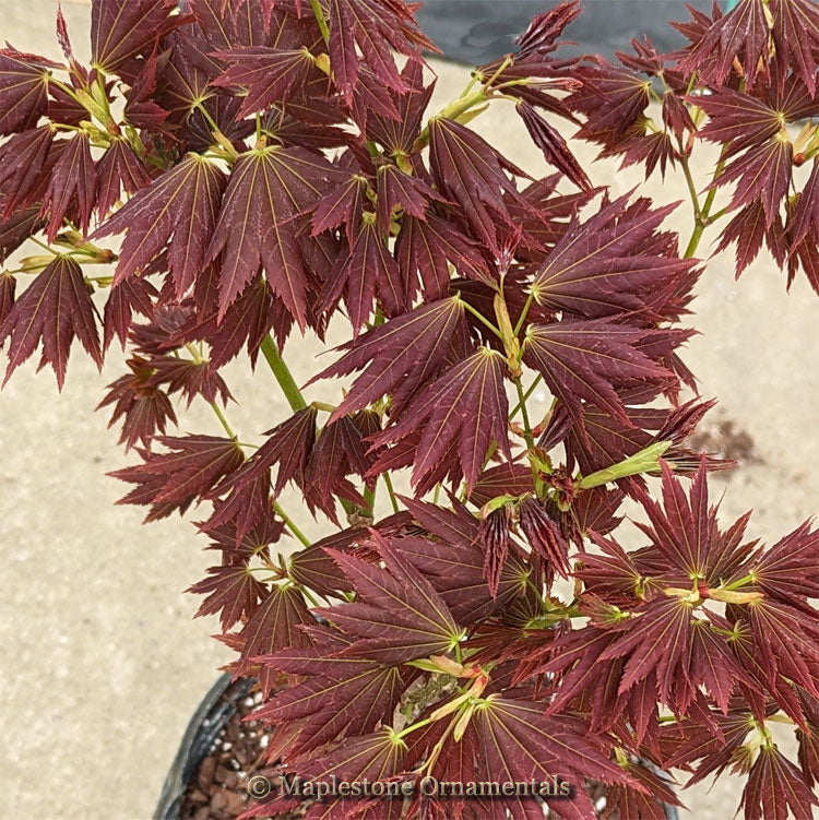 An upright, Full-Moon type Japanese Maple. The spring leaves are a wonderful burgundy-red with hues of pink. The color is further accented by light green veining. The leaves have a fan-like shape. The fall color is bright yellow. Introduced by Talon Buchholz.