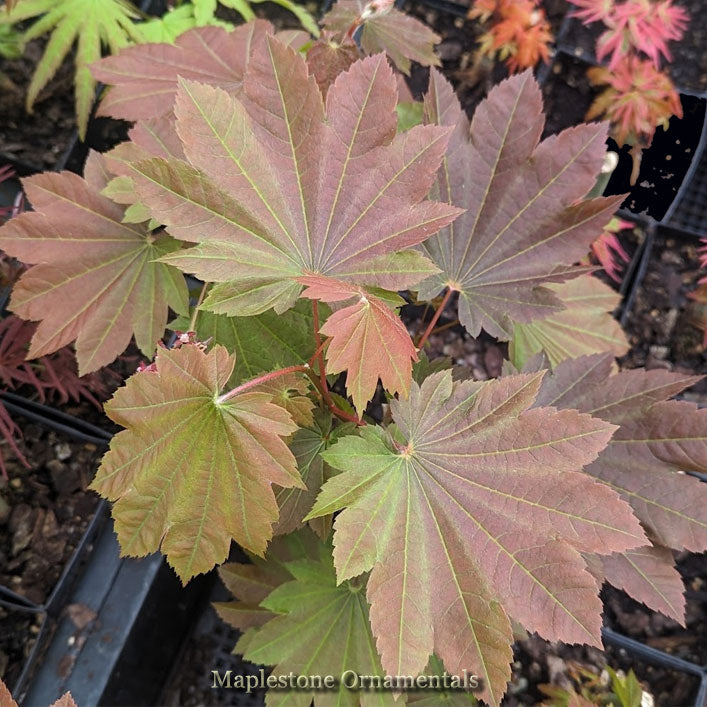 An upright growing variety of Full Moon Japanese Maple. Ruby displays a very unique spring color of ruby-red with an orange blush. The overall look is soft and elegant. The fall color is bright orange-red.