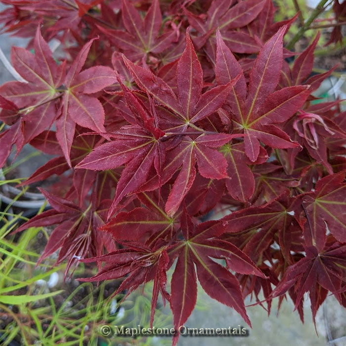 A dwarf, upright Japanese Maple. This variety is also known as 'Beni hoshi' (Ruby Stars in Japanese). The growth habit is somewhat irregular with branches that will turn and grow in different directions. The small, amoenum-type leaf is accented by bright green veining. The spring color is wonderful cherry-red which softens to light orange-red in summer. The fall color is bright golden yellow. 'Ruby Stars' is also popular for bonsai work. Introduced by Del Loucks in 1996 and continues to be a popular variety.