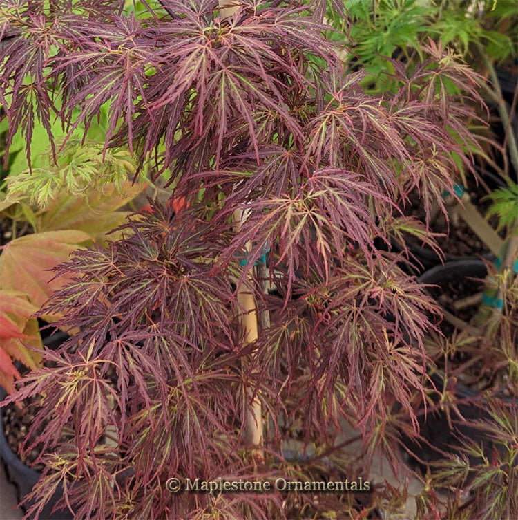 A dwarf, lace-leaf Japanese Maple with weeping branches. 'Scarlet Princess' originated as a witches broom on 'Crimson Queen'. The result is a red dissectum that is incredibly dwarf. The spring leaves are bright pink-red turning to medium red for summer. The fall color is scarlet. Introduced by Thomas and Nancy Ashe.