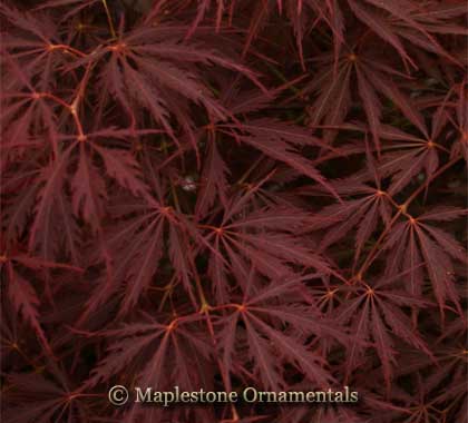 A dwarf, semi-weeping Japanese Maple with deeply divided, serrated leaves. The spring color is bright cherry-red changing to light red for the summer. The fall color is bright scarlet red. This variety is very durable but needs protection from the afternoon sun in hot summer climates. Introduced by Millstone Japanese Maple Nursery in Dadeville, Alabama.