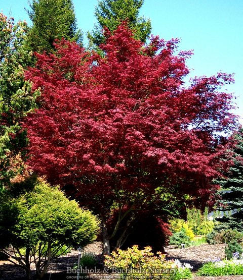 A very nice upright growing Japanese Maple. 'Sherwood Flame' is popular for its color retention and heat tolerance. The spring leaves are bright red changing to medium red for the summer. The fall color is bright cherry red. The tree will eventually grow into a very broad form. Discovered by Will Curtis of Sherwood, Oregon.