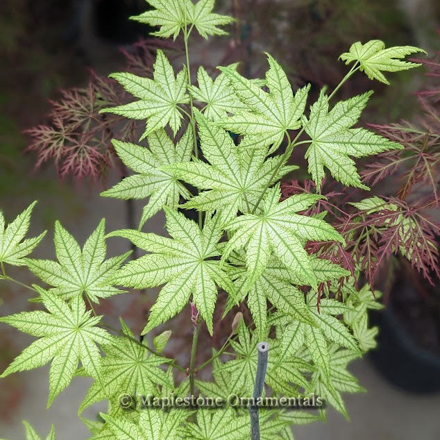 An upright Japanese Maple with reticulated variegation. An old variety that has remained popular with maple collectors. The spring leaves are cream-white with prominent green veining that creates a wonderful contrast on the leaf. The summer color is green before changing to bright red in the fall.
