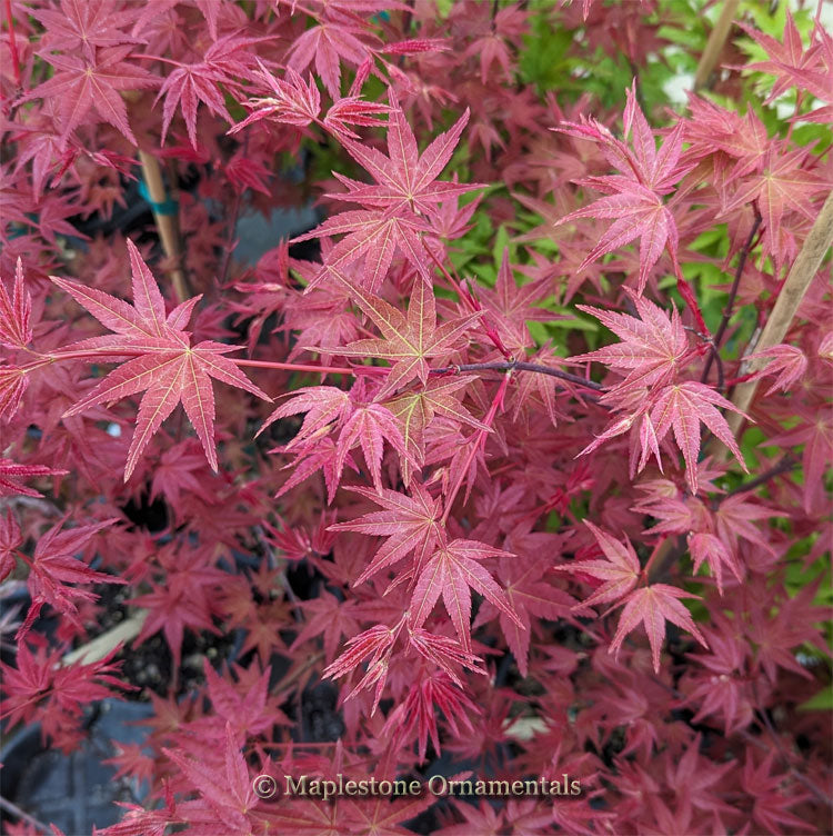 A fast-growing, upright Japanese Maple. This variety is similar to the popular 'Shin deshojo'. The spring color is bright fiery red that literally glows. The color fades to green with red overtones during the summer before changing to bright red in the fall.