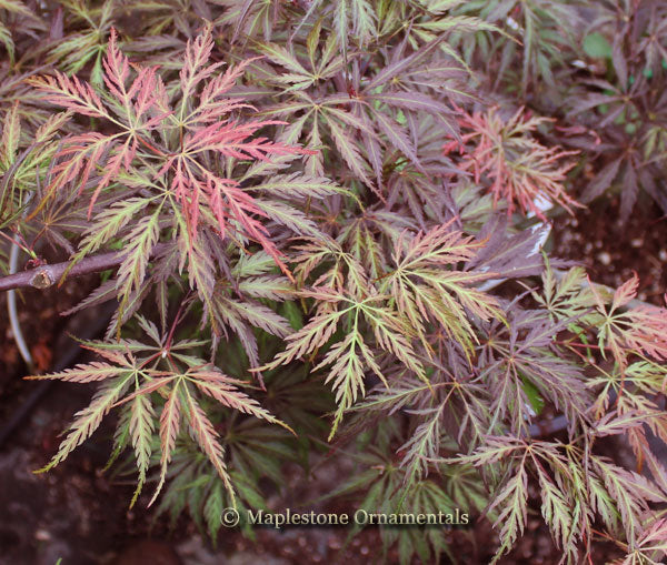 A dwarf, lace-leaf Japanese Maple with weeping branches. The spring color is bright red with pink hues. The summer color turns to light red and then to bronze in late summer before changing to bright scarlet in the fall. Needs plenty of sun for best color. The name means "red star". Introduced by Fratelli Gilardelli Nursery in Italy.