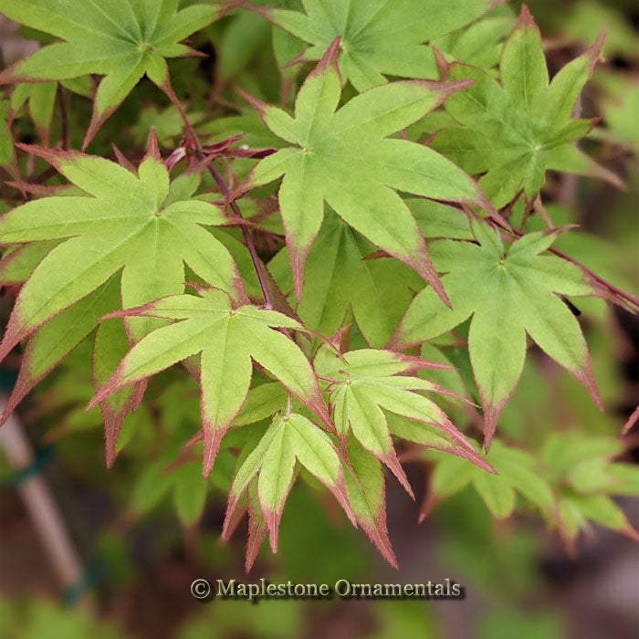 An upright Japanese maple with unique leaves that cup upward from the center. The spring color is green with red tips changing to green for summer. Fall color is bright orange to red. A durable upright selection that will perform well in any landscape.
