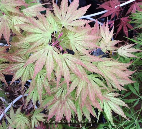 An upright-growing Japanese Maple with fantastic spring color and reticulated variegation. The spring leaves are light yellow-green with rose overtones. The summer color fades to medium green before changing to bright orange in the fall. The dark green veining in the leaf is present during the whole growing season, adding wonderful contrast to the leaf.