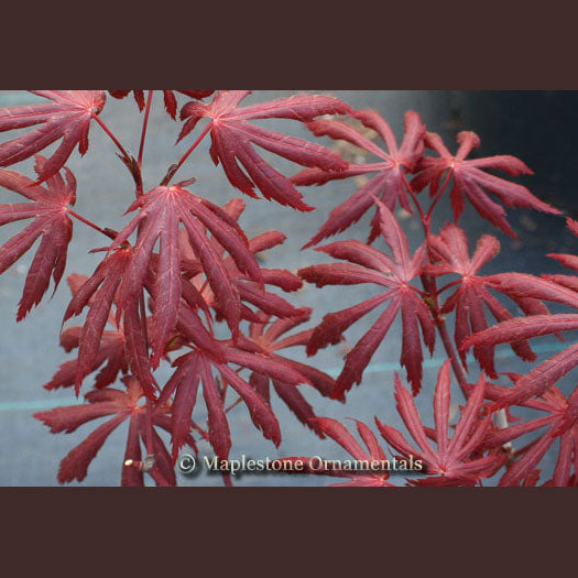 An upright growing Japanese Maple. This variety is popular for its unique leaves, which curl, giving a unique and different appearance. The spring color is dark burgundy red which holds well throughout the summer. The fall color is bright scarlet red.