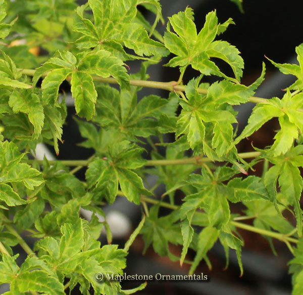 A vigorous upright Japanese Maple. The leaves of this unique variety have a slight crinkle and downward curl. The spring color is rusty-red which quickly changes to green for late spring and summer. The fall color is vibrant orange-red. The name means "Ground Spider".