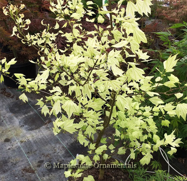 A wonderful variety of Trident Maple with variegated leaves. 'Wako nishiki' has fantastic white or cream-white leaves in spring. In summer the white becomes more subtle as the leaves turn mostly green. The fall color is bright orange-red. Although this variety has a delicate appearance, it is very durable in the landscape, growing to a 12 ft tree in 10 years.