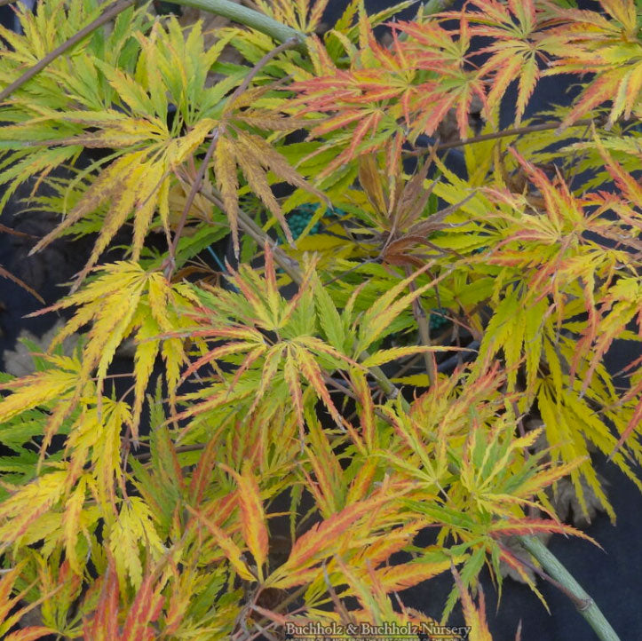 A dwarf, lace-leaf Japanese maple with branches that will arch out instead of weep straight down, which gives the tree more height compared to other dissectum varieties. The name means "Eagle Claw". It was given that name because the sub lobes are serrated instead of dissected giving the appearance of claws. The spring and summer leaves are green changing to vibrant golden-yellow for fall.