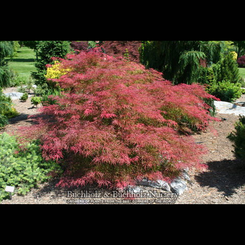 A dwarf, lace-leaf Japanese maple with exceptional spring and summer color. 'Watnong' is one of the most popular dissectum varieties. The spring leaves are a unique red with rose and pink highlights before darkening to bronze with orange highlights in summer. The fall color is bright orange. 'Watnong' has the reputation of being very durable in both northern and southern climates. Discovered by Watnong Nursery in New Jersey.