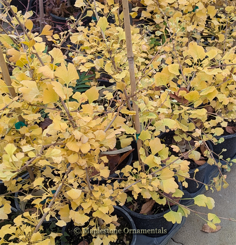 A dwarf Ginkgo with small leaves which are one-third the normal size. This tree will naturally grow into a round shape but can be staked for more height. Fall color is bright yellow. Discovered by Crispin Silva of Oregon.