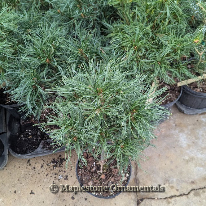A compact form of Eastern White Pine with a round shape when young. Eventually, the shape will develop into a wide pyramid. Short, soft blue-green needles have considerable twisting. A very choice selection for a small spot in the landscape.
